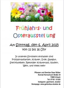 Hiermit laden wir Sie rechtherzlich, am Sonntag, den 06.04.25 von 11 – 16 Uhr, zu unserer Frühjars- und Osteraustellung ein. Wie jedes Jahr stehen wir Ihnen mit Rat und Ideen zur Seite, um Ihr Osterfest zu einer unvergesslichen Zeit zu machen. Wir haben viele schöne Geschenkideen für Sie bereit gestellt. Um aber längere Wartezeiten zu vermeiden nehmen wir gerne auch Vorbestellungen entgegen.